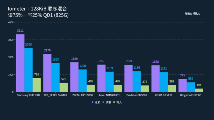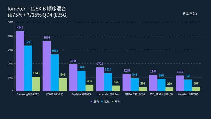 但是,仔细看一下,可以发现三星9100 PRO在QD1-4队列下的128K顺序混合读写表现优秀,这意味着在被要求大数据边拷进边读取的情况下,该盘可以说是具有绝对优势的。