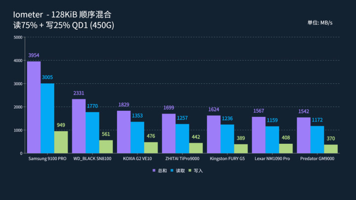 性能表现又出现了变化。QD1下,三星9100 PRO的4K随机混合速度再一次被削弱,仅剩下59.4 MB/s。