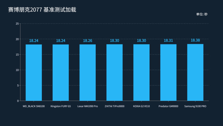 7款SSD的表现几乎没有差别,最快的是WD_BLACK SN8100和金士顿FURY G5,均耗时18.24秒,并列第一;其次是雷克沙NM 1090 PRO,耗时18.30秒;最慢的是三星9100 PRO,耗时18.38秒。