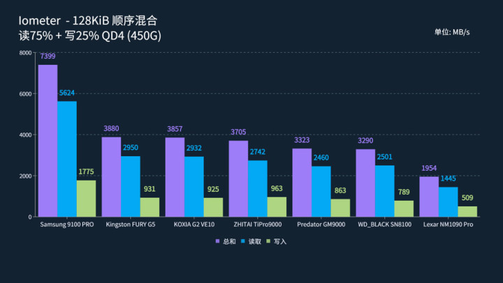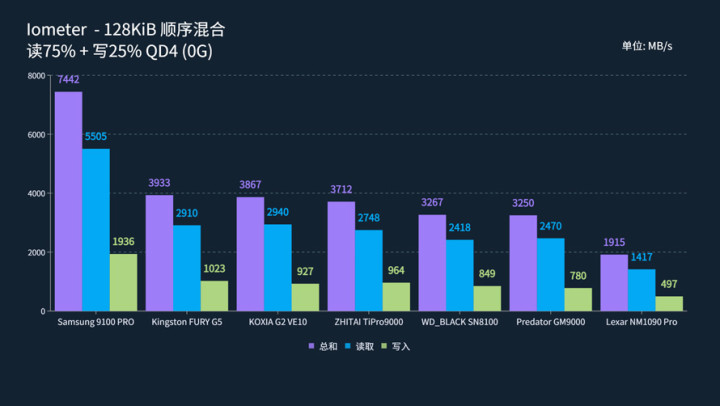在QD4空盘下,三星9100 PRO优势继续,以7442 MB/s的总和速度取得显著领先;