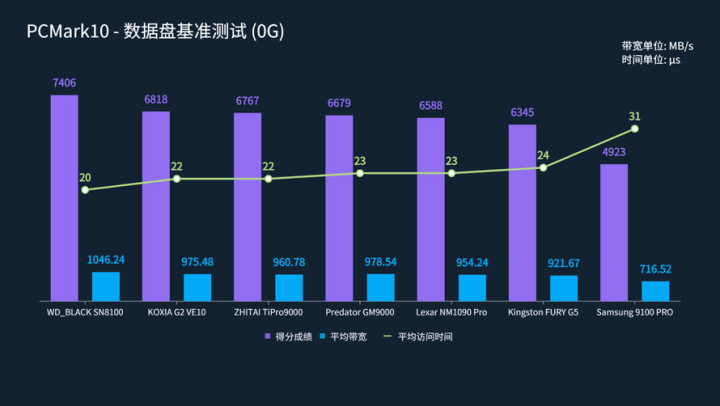 三星9100 PRO是本次测试中表现最差的,只有716.52 MB/s的带宽和31的访问延迟,相比其他盘具有较大差距。