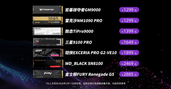 那么本次评测的这7款SSD,我们将每块盘目前的售价列在这里,供大家参考(截至26年2月11日)。
