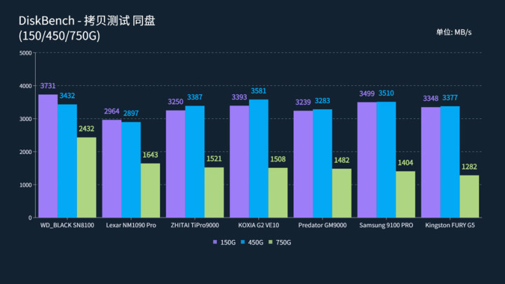 WD_BLACK SN8100表现最佳,即使在750G占用的情况下同盘/异盘均有着最快的拷贝成绩;