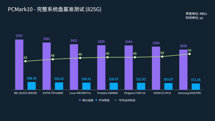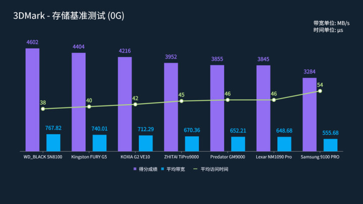 性能表现最好的是WD_BLACK SN8100,综合得分为4602,平均带宽为767.82 MB/s,访问时间为38微秒。