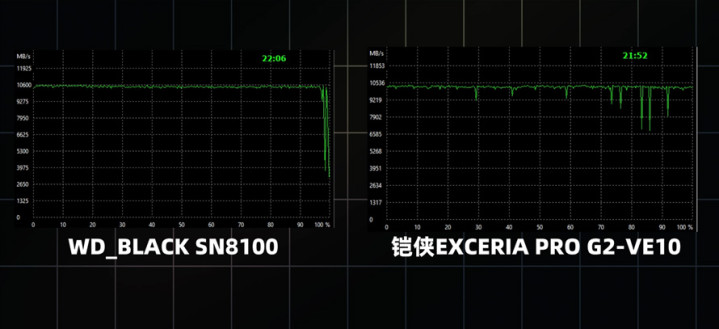 WD_BLACK SN8100与铠侠VE10这两款SSD几乎可以全程都保持在缓内。