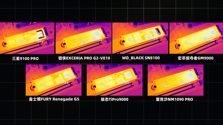 写入温度上,除开铠侠VE10不算,表现最好的是WD_BLACK SN8100,温度为56/72度;致态TiPro9000温度控制也整体不错,为56/77度;宏碁GM9000为59/76度,表现也属于中上游水准。