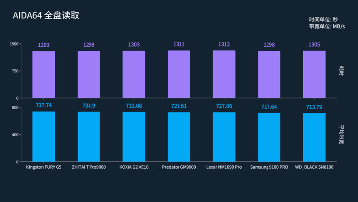 整体看下来7块盘之间的差异很小。表现最好的是金士顿FURY G5,耗时1293秒完成全盘读取,以737.74 MB/s的速度位列第一。