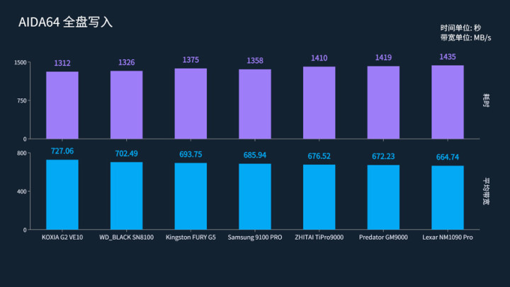 表现最好的是铠侠VE10,耗时1312秒,平均带宽为727.06 MB/s。