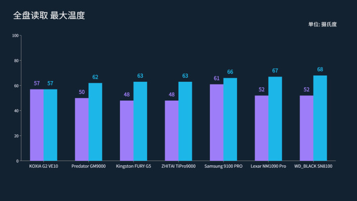 剩余6块盘里,全盘读取下温度表现最好的是宏碁GM9000、致态TiPro9000、以及金士顿FURY G5,基本都是48-50/62-63度。