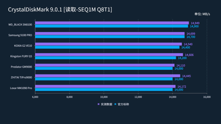 读取方面,每款SSD都能达到或超过官方标称值。其中最快的是WD_BLACK SN8100,达到了14949 MB/s的速度,三星9100 PRO以14699 MB/s的速度位列第二,金士顿FURY G5则是以14606 MB/s拿下了第三名。