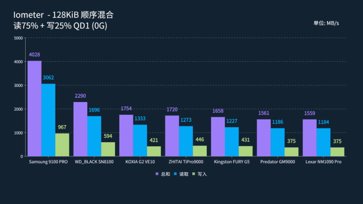 那么首先来看一下128K顺序混合读写下,空盘的情况。在QD1下,三星9100 PRO以4028 MB/s的总和速度拿下了QD1的排名首位,领先第二名WD_BLACK SN8100的2290 MB/s接近76%。