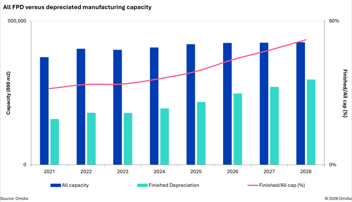 Omdia最新研究显示,平板显示器(FPD)制造设备的折旧速度正在加快,这将缓解OLED和LCD面板厂商的成本压力。Omdia预测,2021至2028年间折旧将以9.3%的复合年增长率增长,全球已完全折旧的FPD制造产能在此期间几乎翻倍,从约1.6亿平方米增至近3亿平方米。