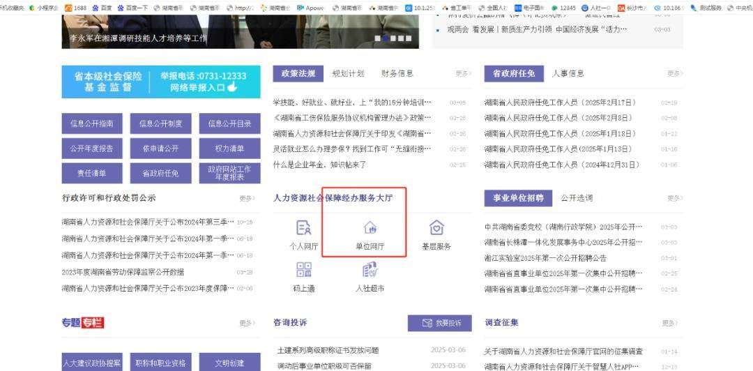 搜索:湖南省人社厅,进入湖南省人社厅官网,在该官网的中间位置找到单位网厅,如下图所示。