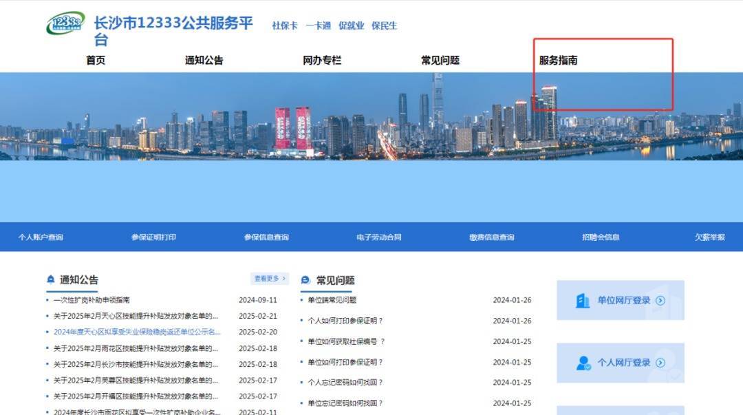 答:网页搜索长沙12333公共服务平台,网页打开后点击右边栏目-服务指南,服务指南里有建设项目参保、延期、修改专管员业务的办理指南及业务资料空白表。如下图所示。